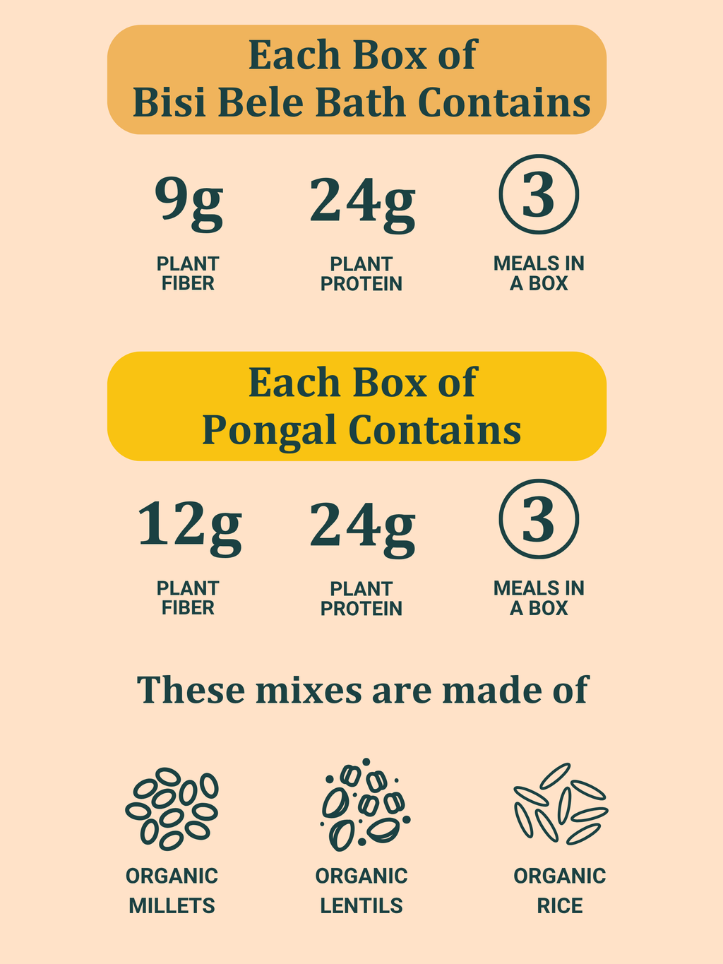 These pre-measured mixes of Pongal and Bisi Bele Bath are made of organic, roasted rice, lentils, millets and regeneratively-farmed spices!