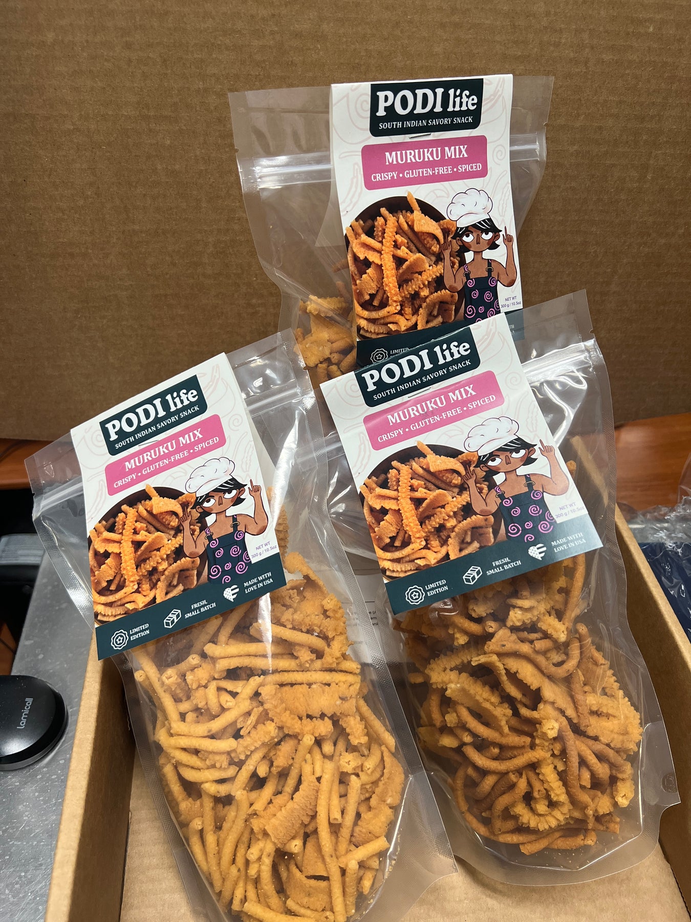 Paired with an assortment of 3 bags of Murukku (gluten-free South Indian rice-flour crunchy snacks, small-batch manufactured in Atlanta).