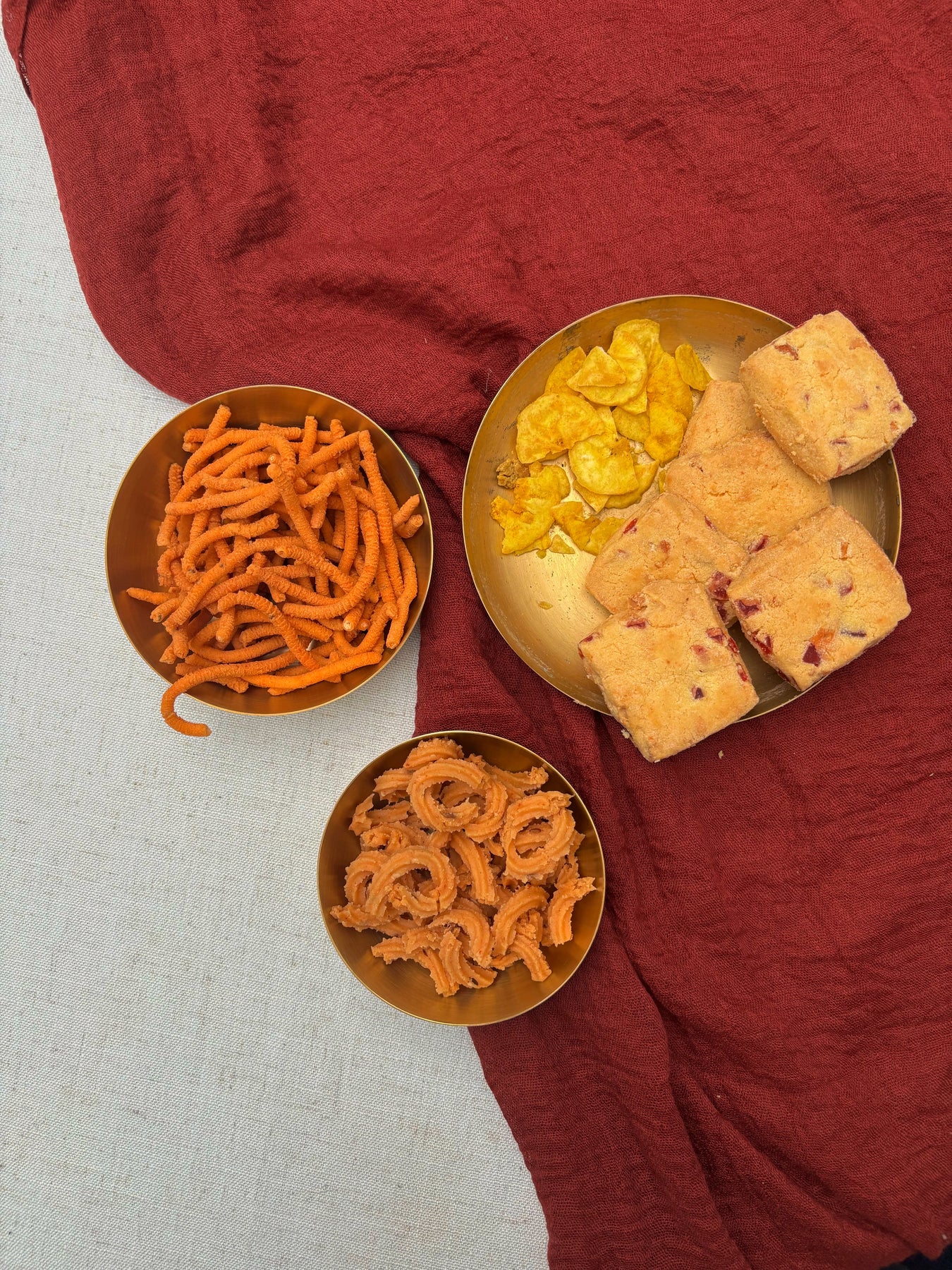 Paired with an assortment of 3 bags of Murukku (gluten-free South Indian rice-flour crunchy snacks, small-batch manufactured in Atlanta).